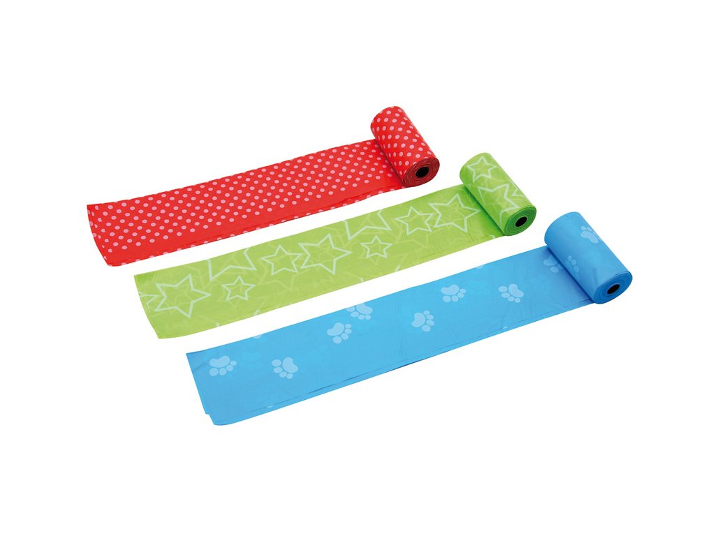Balení 3 kotoučů pevných sáčků na psí exkrementy, které se vejdou do většiny dávkovačů a držáků na sáčky. Každý kotouč obsahuje 20 sáčků pro všechna plemena. Sáčky mají milé vzory hvězdiček, teček a tlapek.