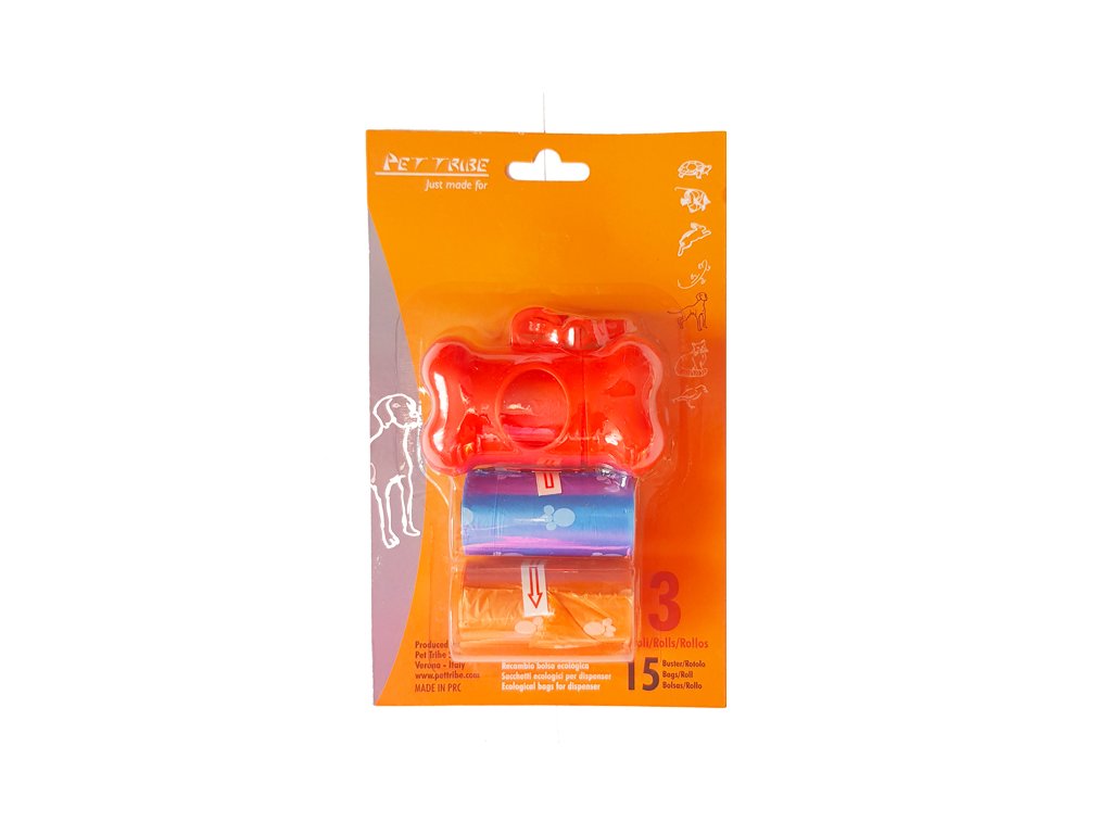 Zásobník na sáčky na psí exkrementy s možností připnutí na vodítko. Balení obsahuje také 3 kotouče sáčků na psí exkrementy, které se vejdou do většiny dávkovačů a držáků na sáčky. Každý kotouč obsahuje 15 sáčků. Jsou ideální pro všechna plemena.