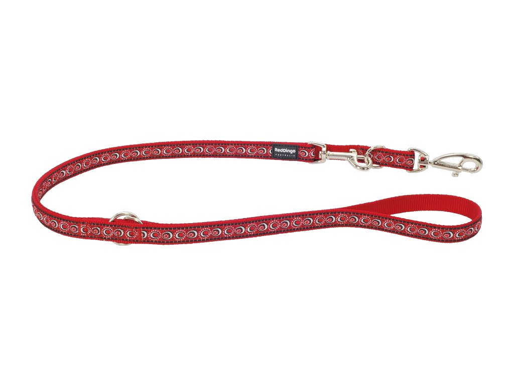 Elegantní bezpeční přepínací vodítko pro psa se vzorem COSMOS červené Red Dingo. Přepínací vodítko má délku 2,0 m a je ukončena kvalitními karabinami přiměřeně silnými k tloušťce vodítka s jedinečným designem na obou koncích. Díky třem pevným svařovaným nerezovým D-kroužkem je snadno nastavitelná na různé použití. Multifunkční vodítko pro psa umožňuje použít jako vodítko pro chůzi u nohy, vodítko pro 2 psy, stejně jako "hands free" vodítko. Kromě toho může být použito jako kratší nebo delší vodítko na fixování k předmětu psa při odložení. Je skvělé pro "hands free" chůzi ve městě a také se snadno nastaví na správné šířku chodníku (možnost nastavit až na 3 různé délky)..