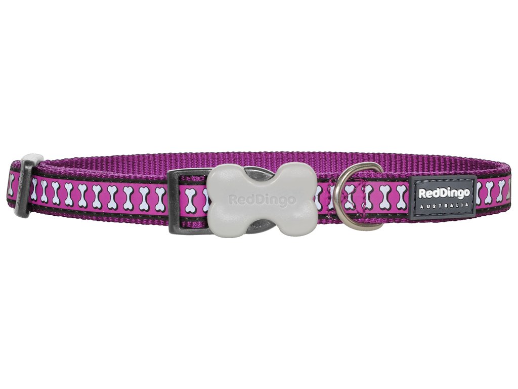 Nylonový reflexní obojek pro psa fialoné barvy od australské značky RED DINGO. Tyto obojky jsou velmi kvalitní, trvanlivé, pevné a vypadají na pejskovi výborně. Obojky jsou vyrobeny z velmi kvalitního a pevného nylonového materiálu. Jedinečná spona ve tvaru kosti Bucklebone je jednou z nejpevnějších spon na trhu.