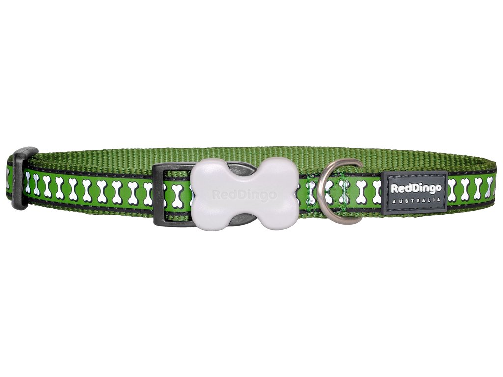 Nylonový reflexní obojek pro psa tmavě zelené barvy od australské značky RED DINGO. Tyto obojky jsou velmi kvalitní, trvanlivé, pevné a vypadají na pejskovi výborně. Obojky jsou vyrobeny z velmi kvalitního a pevného nylonového materiálu. Jedinečná spona ve tvaru kosti Bucklebone je jednou z nejpevnějších spon na trhu.