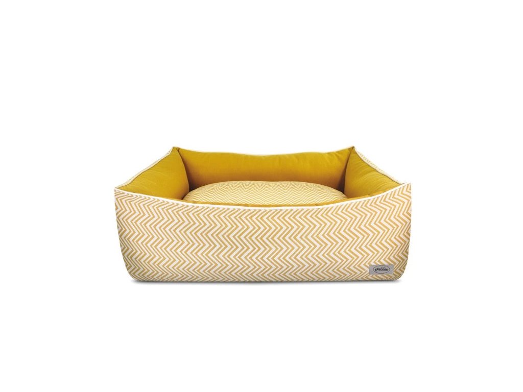 Velice komfortní pelíšek pro psa. Vyrobeno z inovativního materiálu - polybavlny, tkaniny určené k dekoraci interiéru. Polybavlna je prodyšná, měkká a pohodlná, pevnější než standardní bavlna. S elegantním žakárovým vzorem a pevným vnitřním polštářem a výplní. Vzor s plnými barvami a geometrickými kresbami.