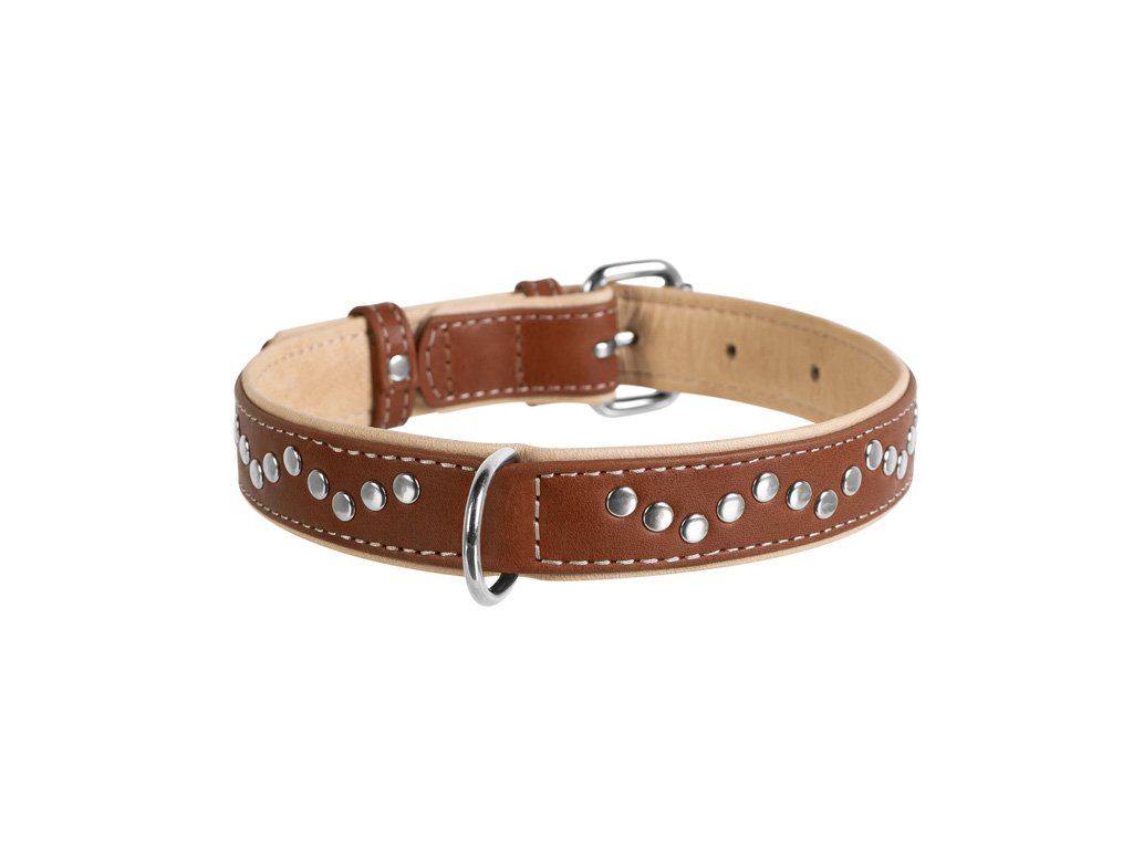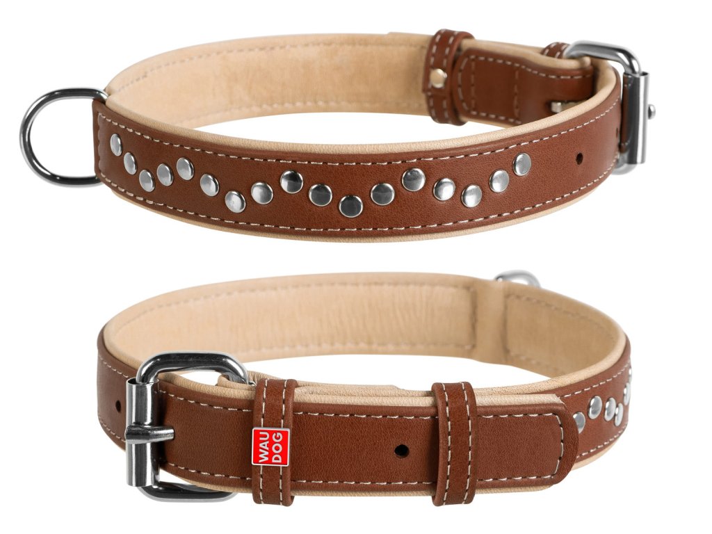 Ručně šitý vysoce kvalitní ručně vyráběný měkkým polstrováním kožený obojek s lesklým zapínáním, pevným kroužkem a kovovou dekorací. Přírodní dvouvrstvá hebká a přitom odolná kůže nejenže hezky vypadá, ale také poskytuje dlouhotrvající použití. Tyto obojky jsou součástí naší Soft kolekce a jsou vhodné pro psy s citlivou kůží nebo alergické na nylon. Tento atraktivní obojek je vyráběn v různých velikostech od štěňat až po velká plemena. Tento kožený je výborně promyšlený v každém detailu.