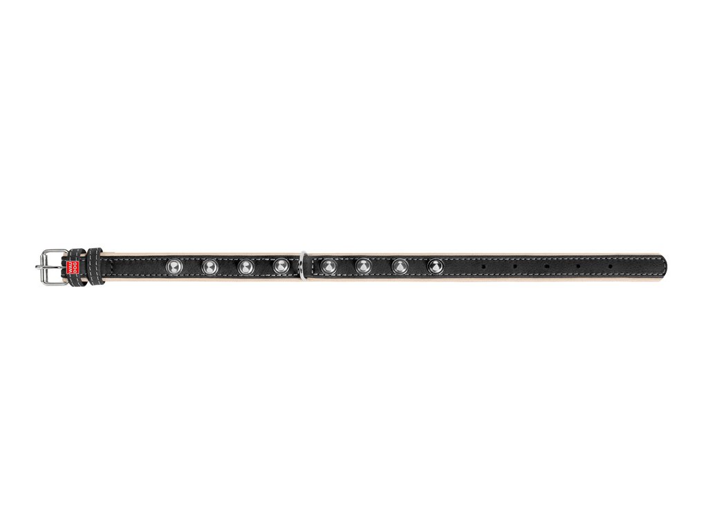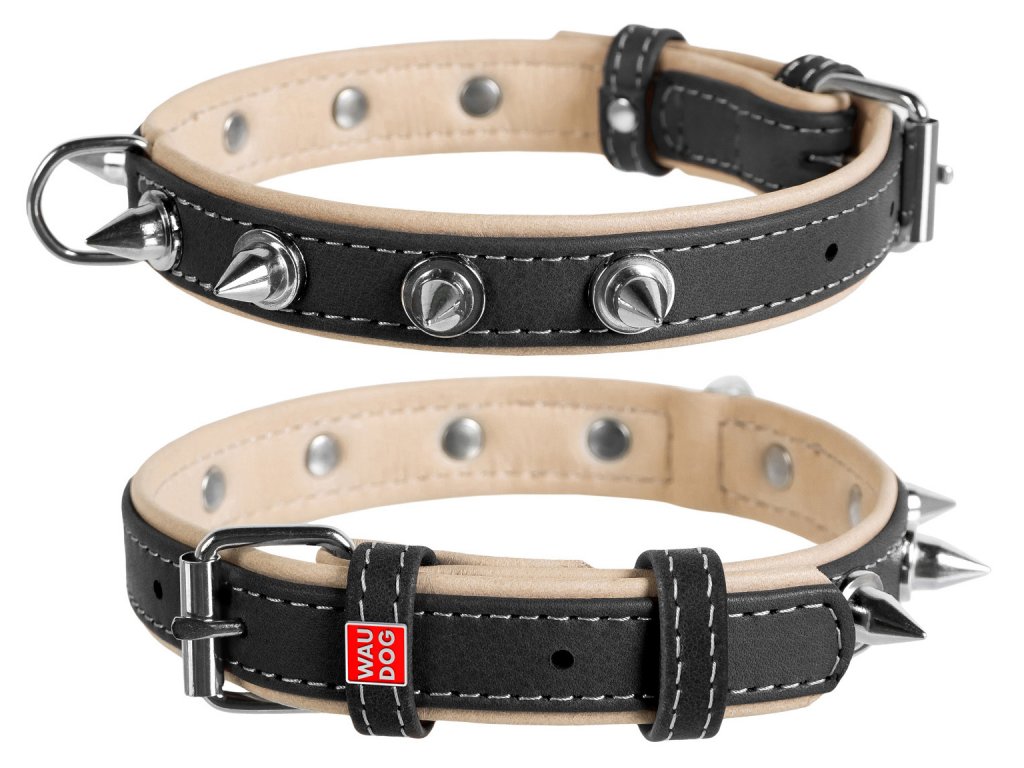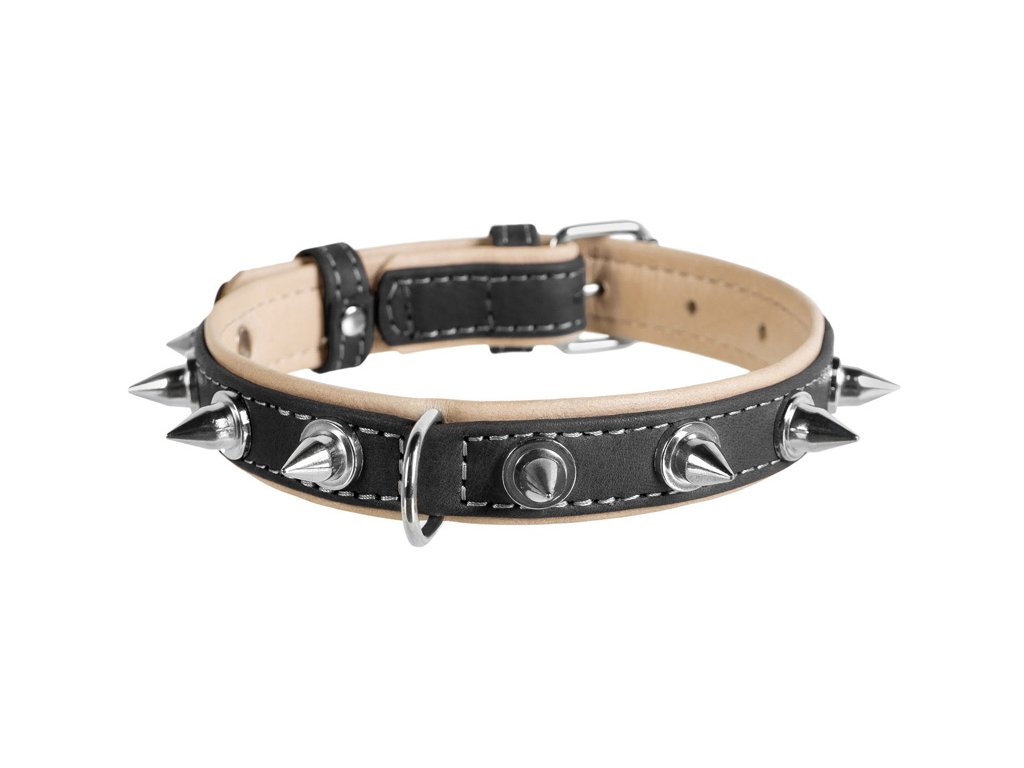 Ručně šitý a ručně vyráběný, velmi jemný a měkký, vysoce kvalitní dvouvrstvý kožený obojek s kovovými ostny, s lesklým zapínáním a pevným kroužkem. Přírodní dvouvrstvá velmi jemná a přitom odolná kůže nejenže hezky vypadá, ale také poskytuje dlouhotrvající použití. Tyto obojky jsou součástí naší Soft kolekce a jsou vhodné pro všechny psy ale zejména pro psy s citlivou kůží nebo alergické na nylon. Tento atraktivní obojek je vyráběn v různých velikostech od štěňat až po velká plemena. Tento kožený obojek je výborně promyšlený v každém detailu. Kroužek na zapínání vodítka je na vrchní straně, čili pěkně vidět celou dekoraci obojku.