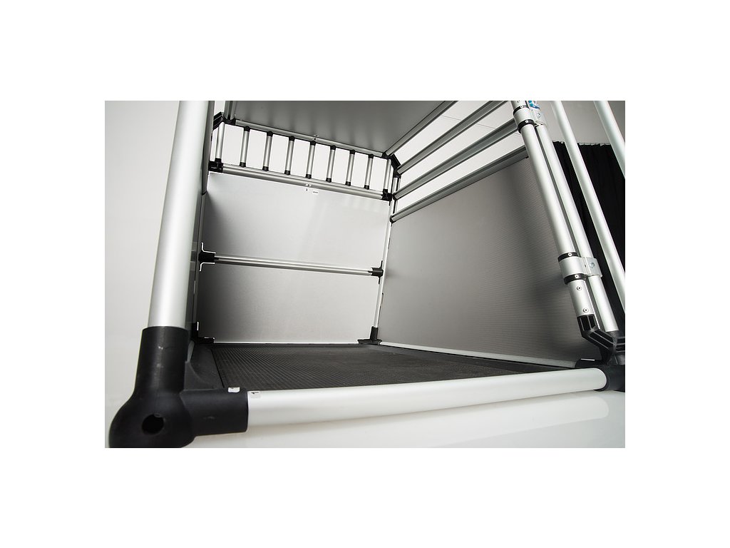 - stabilní hliníkový rám a pevné spoje: rohové spojky jsou vyztuženy skleněnými vlákny a pevně přišroubovány k speciálně tvarovaným tyčím. Toto dělá přepravku pro psa mimořádně stabilní.