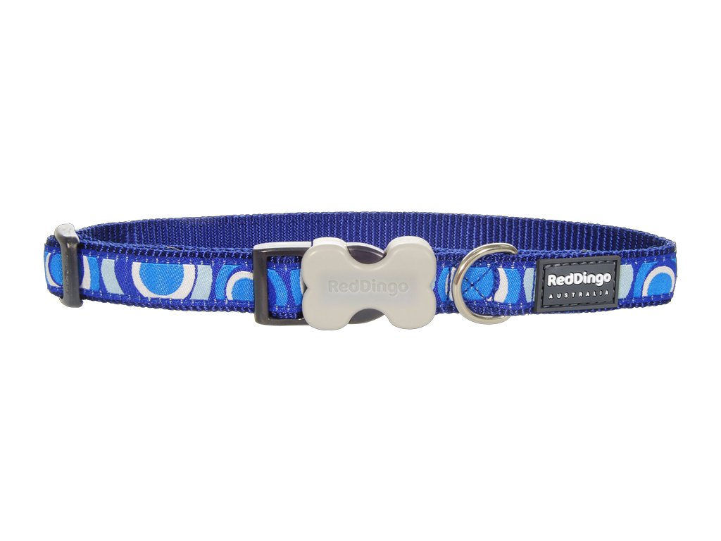 Nylonový obojek pro psa modré barvy se vzorem CIRCADELIC od australské značky Red dingo. Tyto obojky jsou velmi kvalitní, trvanlivé, pevné a vypadají na pejskovi výborně. Obojky jsou vyrobeny z velmi kvalitního a pevného nylonového materiálu. Jedinečná spona ve tvaru kosti Bucklebone je jednou z nejpevnějších spon na trhu.