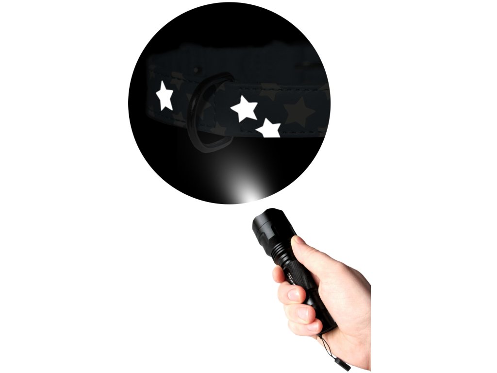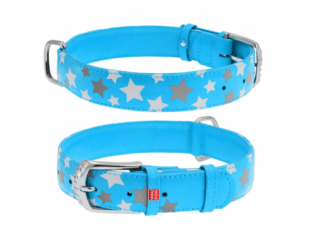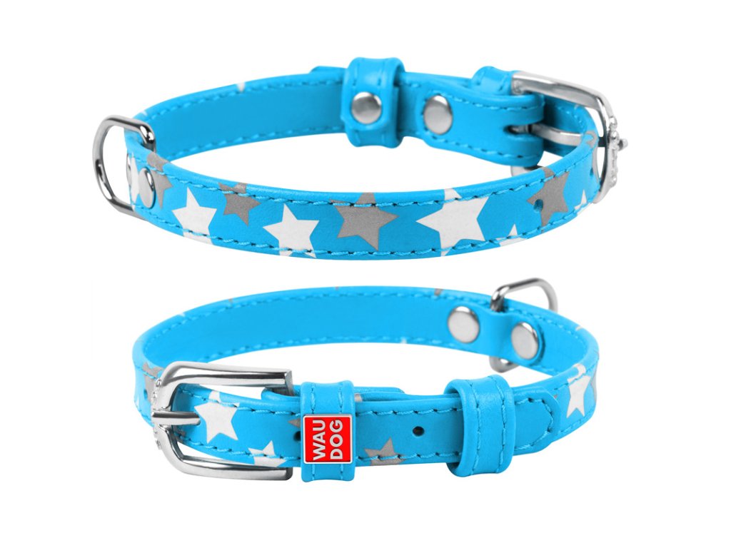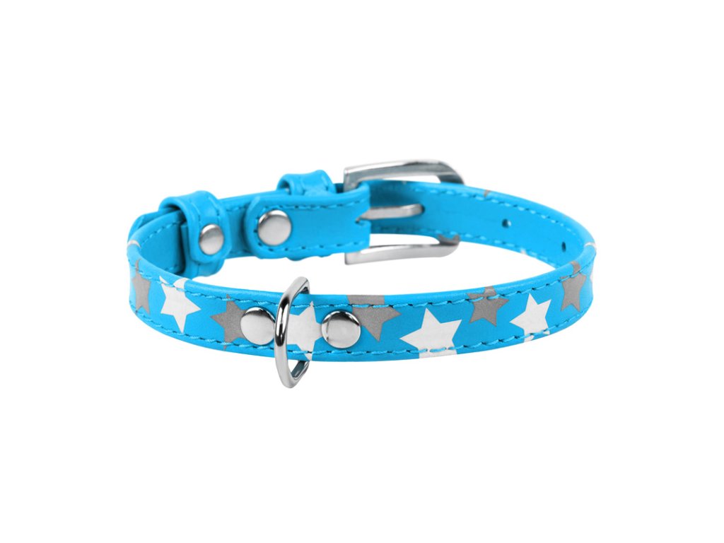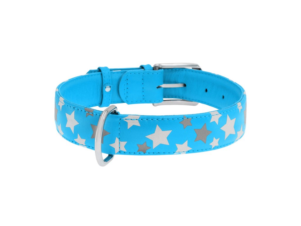Plochý kožený obojek s hvězdičkami modrý svítící