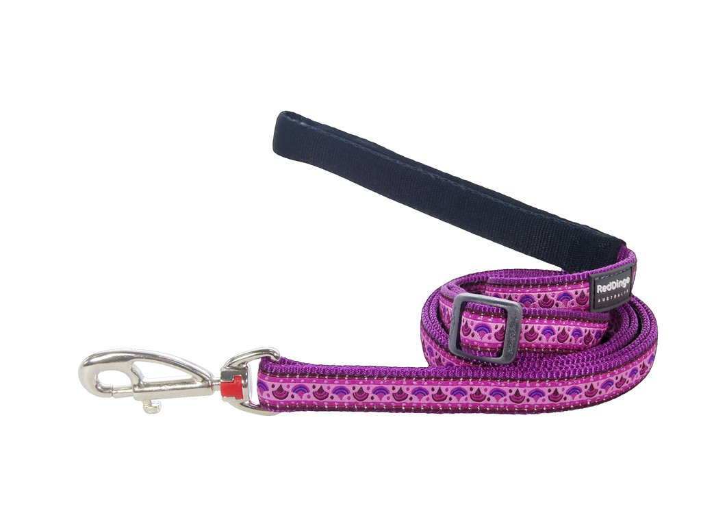 Nylonové vodítko pro psa fialové barvy se vzorem CARNIVAL z nylonového materiálu. Délka vodítka lze měnit pomocí praktické spony, přičemž maximální délka při klasicklom vodítku je 180cm. Rukojeť vodítka je polstrovaná, čímž zvyšuje komfort pro majitele při držení a taháni psa. Všechny vodítka jsou ukončené pevnou karabinou.